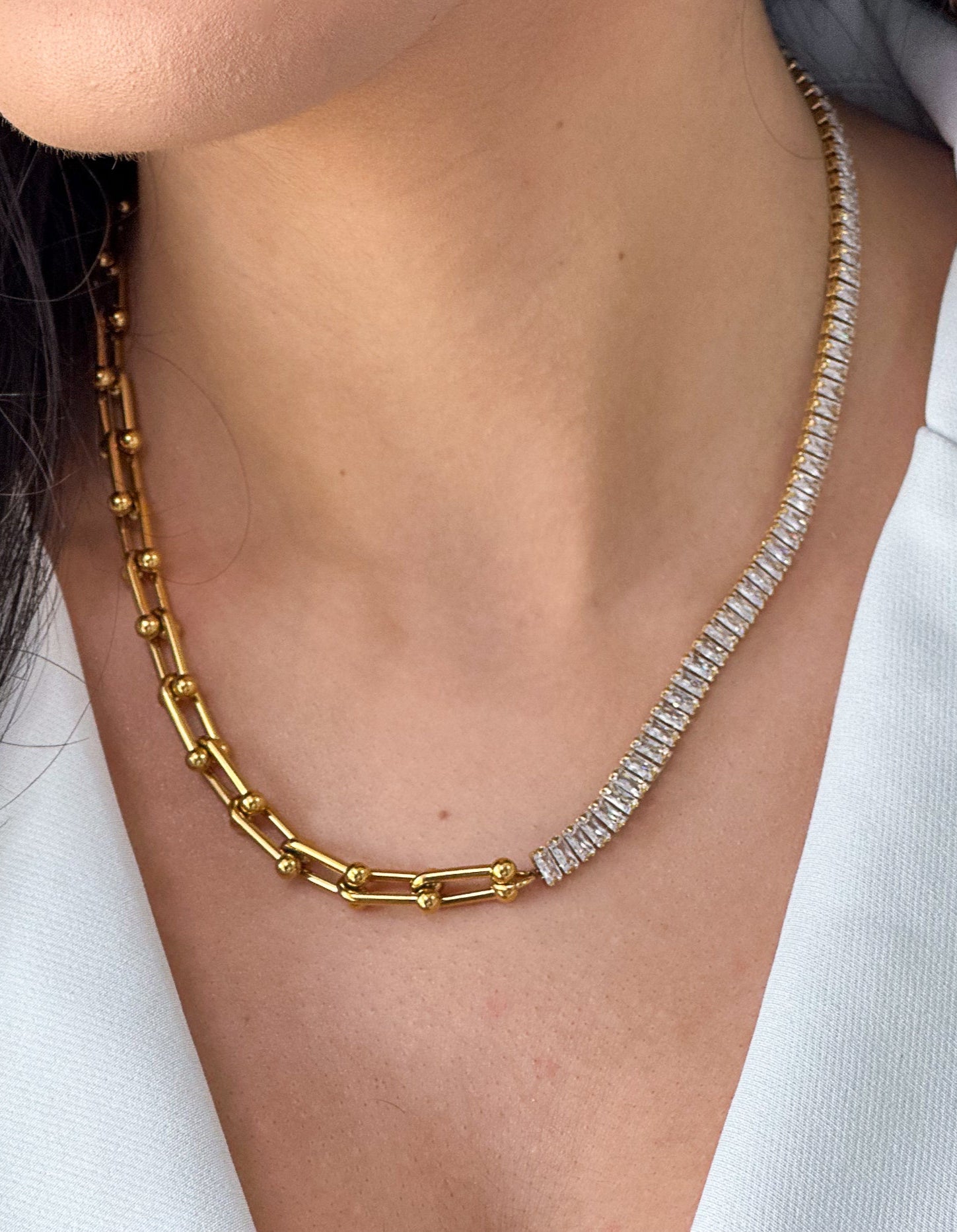 18K gold-plated stainless steel, this unique link chain is tarnish-free, water-resistant, hypoallergenic and embellished with sparkling zirconia crystals.