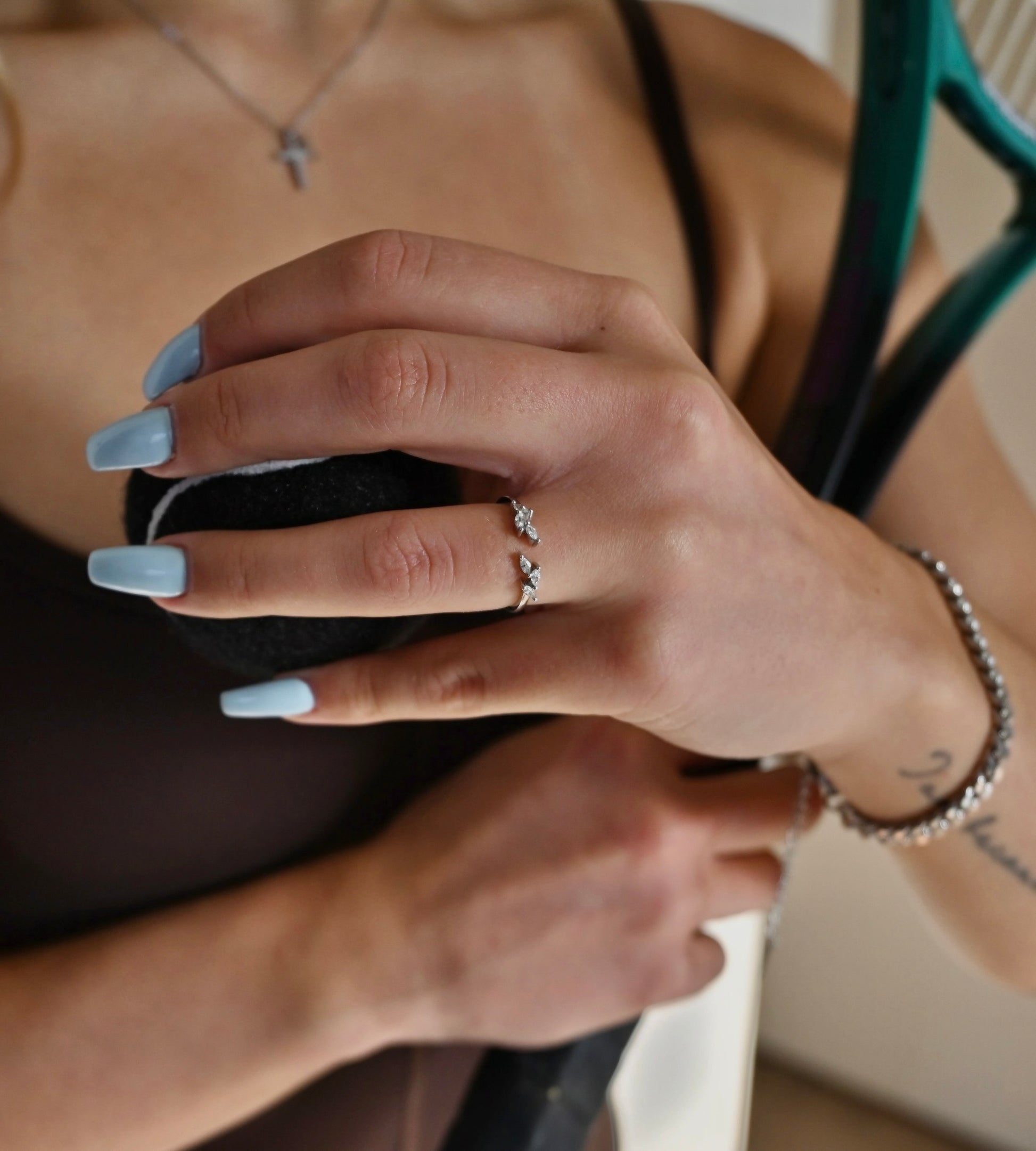 Moissanite diamonds set in an elegant, nature-inspired open band crafted from premium 925 sterling silver. Designed for everyday wear, it’s waterproof, hypoallergenic, and tarnish-free.