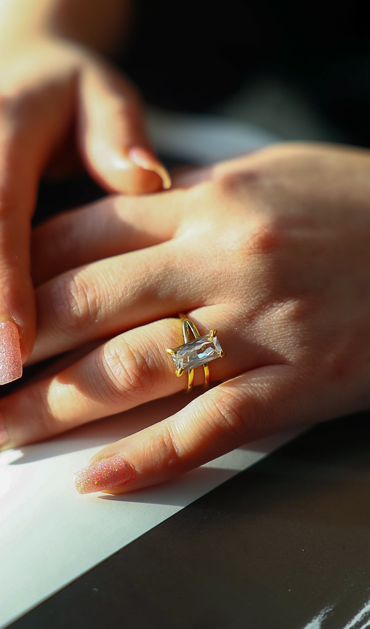 18k gold plated hypoallergenic, tarnish-free, water-resistant titanium steel . This ring features a sparkling rectangle zirconia crystal.