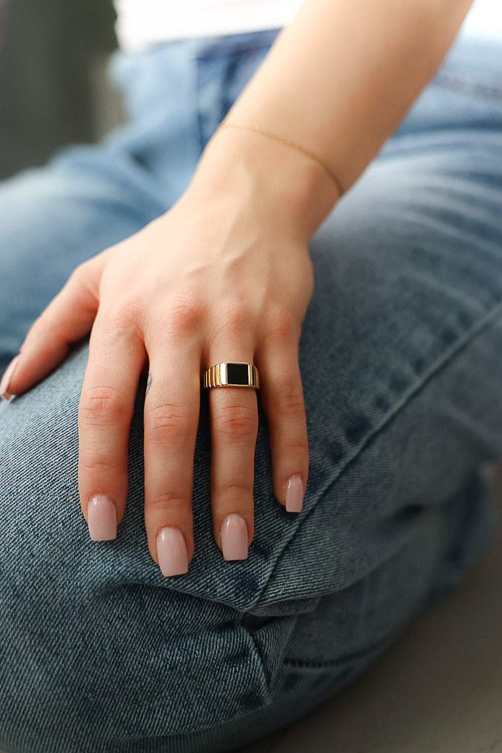 18k Gold-Plated Ring, featuring a striking black zirconia crystal. Water-resistant and hypoallergenic, making it perfect for everyday wear.