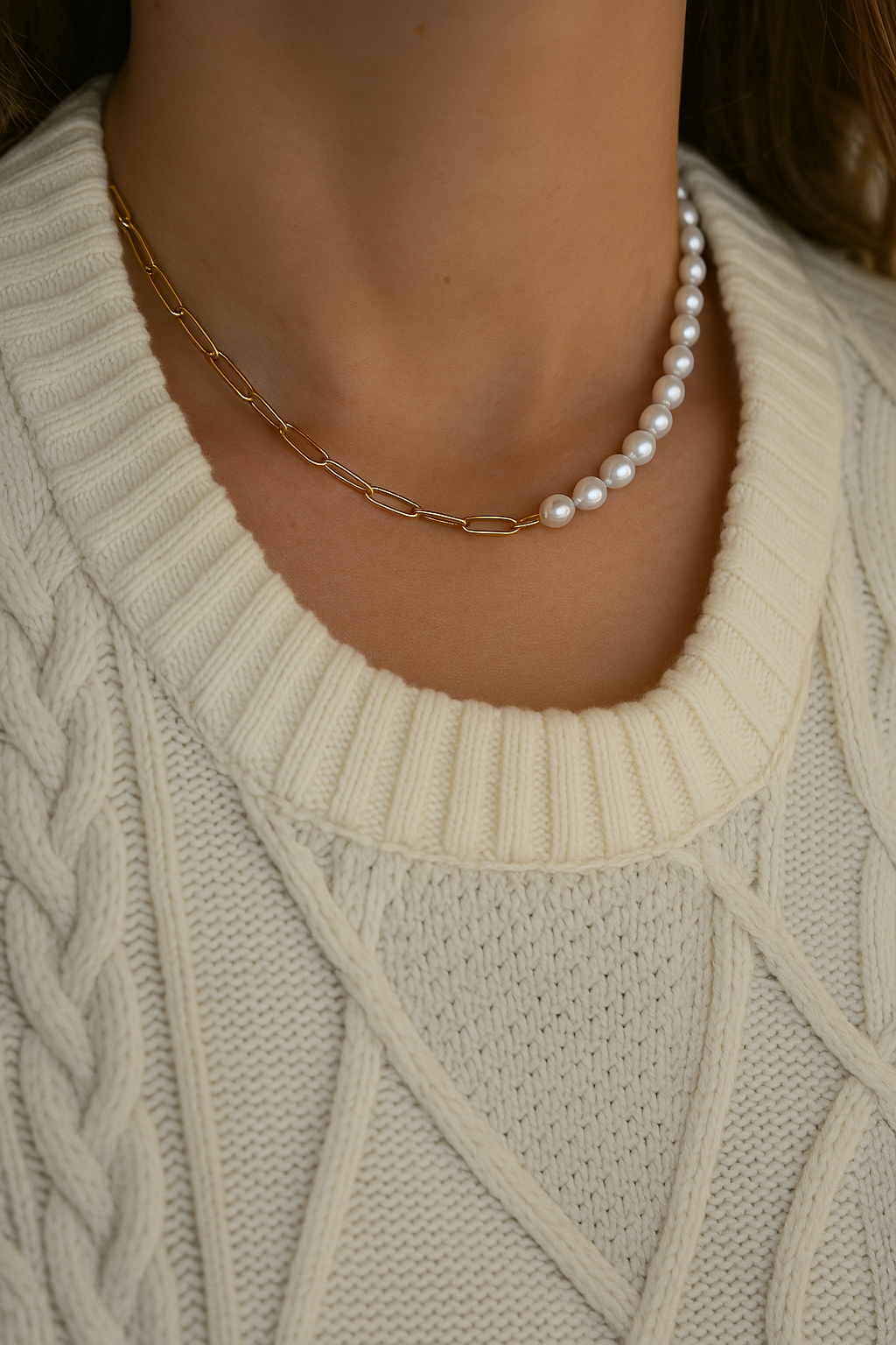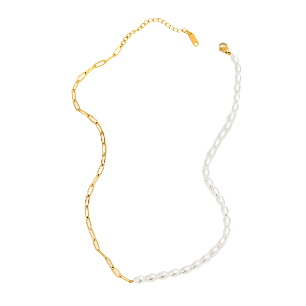 18k gold-plated pearl chain necklace that is high-quality, waterproof, hypoallergenic, and tarnish-free.