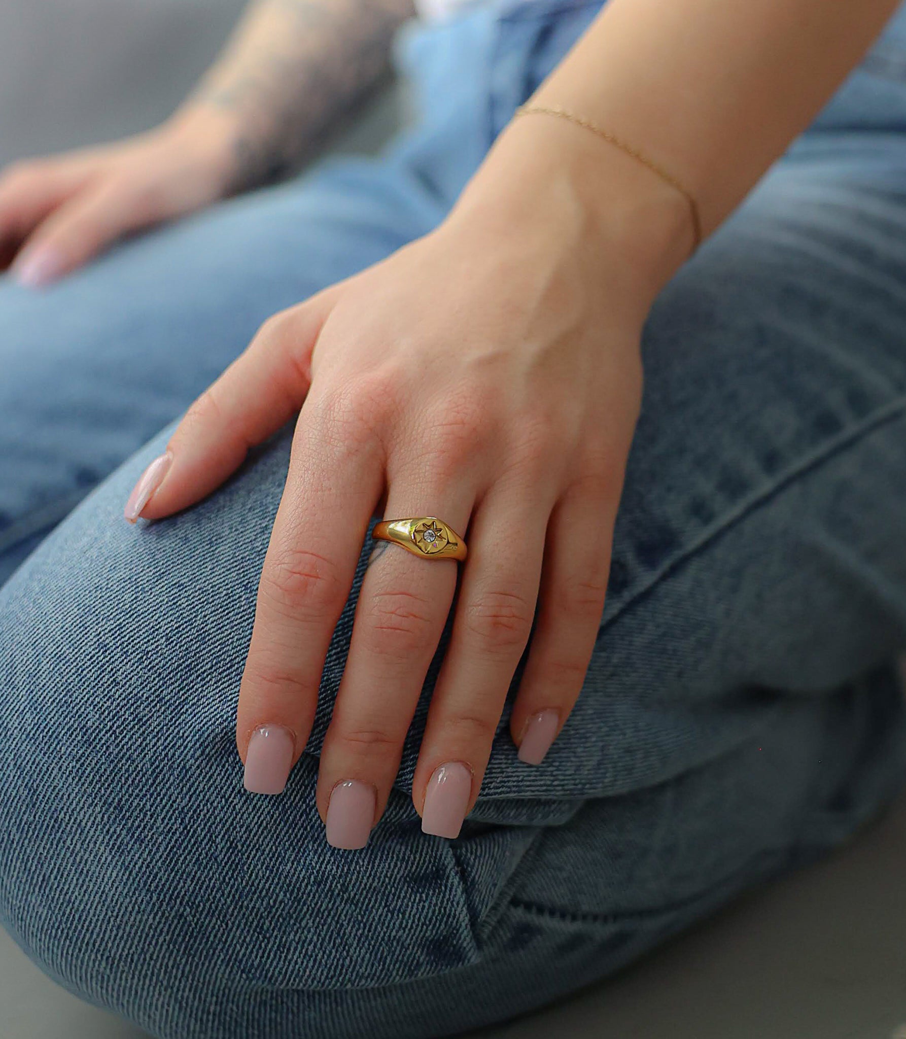 18k gold plated stainless steel Signet Ring. Made with water-resistant, tarnish-free, and hypoallergenic materials, this ring is designed for lasting wear and comfort.